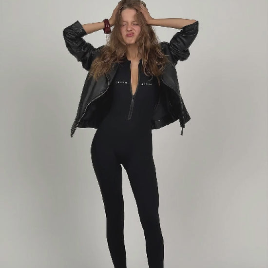 Image Inspiration: Charlie paired the jumpsuit with a leather jacket, ankle boots, gloves, and sunglasses. Did someone say roadtrip?